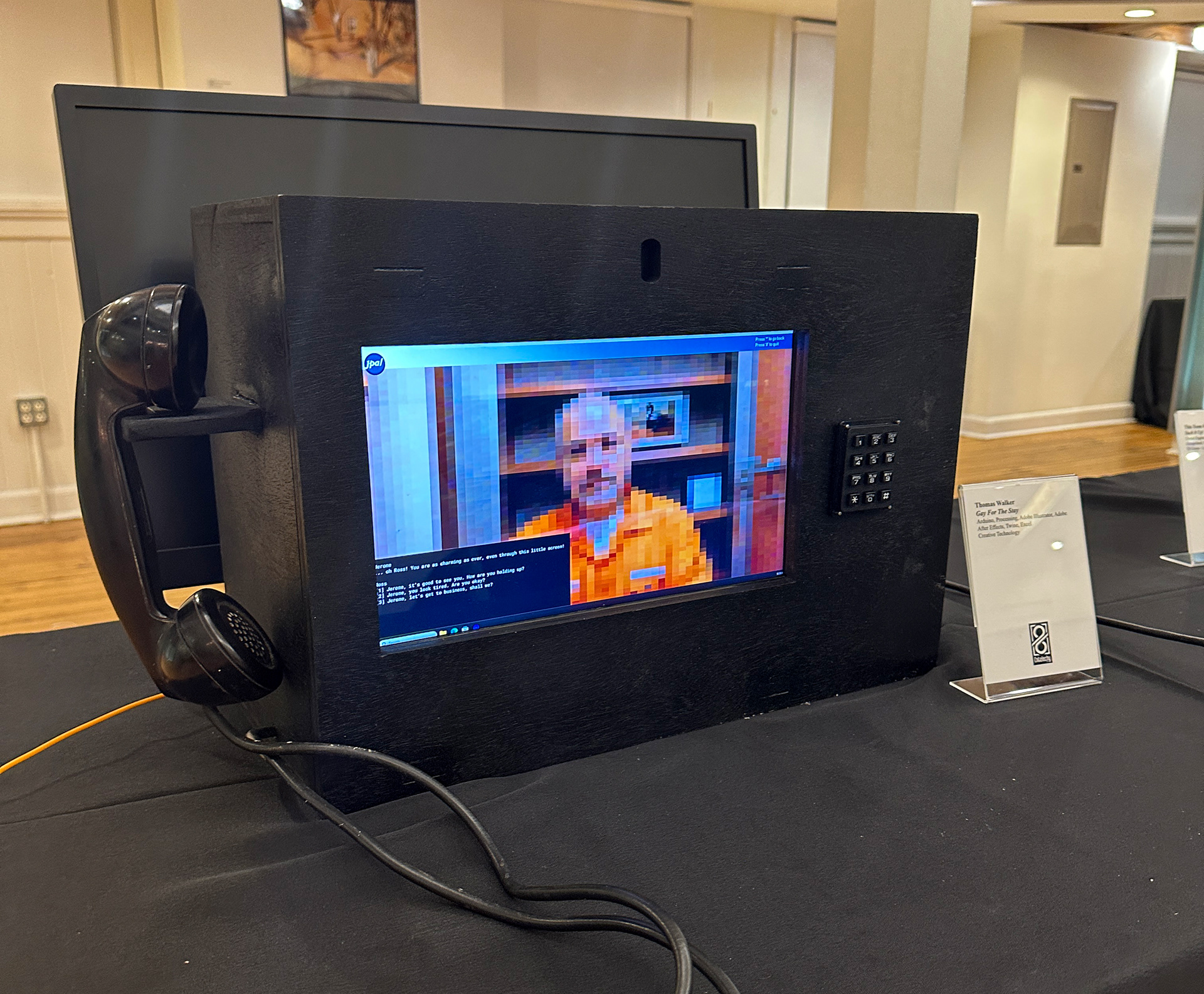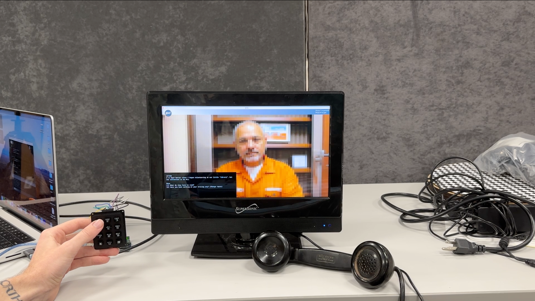The physical structure is designed to imitate video visitation systems used to facilitate calls between inmates and their visitors. It uses a number pad for all interactions by the user, giving an analog feel and a sense of the 90’s time period. The pixelated graphics and dialogue box take inspiration from narrative video games which provides cues for the viewer to interpret how to interact with the interface.Process