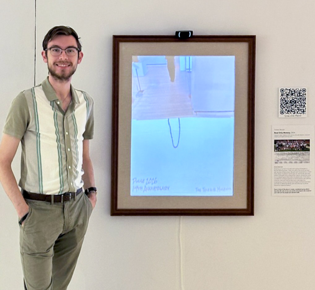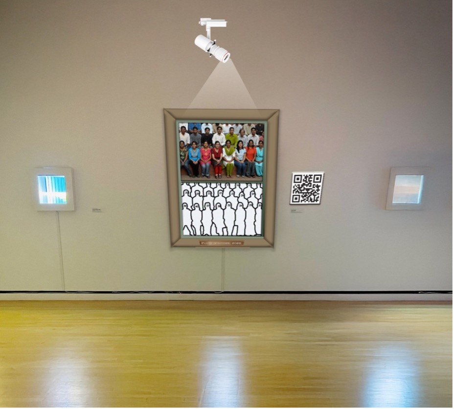 The viewer approaches the photo frame and is labeled automatically with a number. The installation takes a photo of them, which the viewer can then download by scanning a QR code and downloading the image.