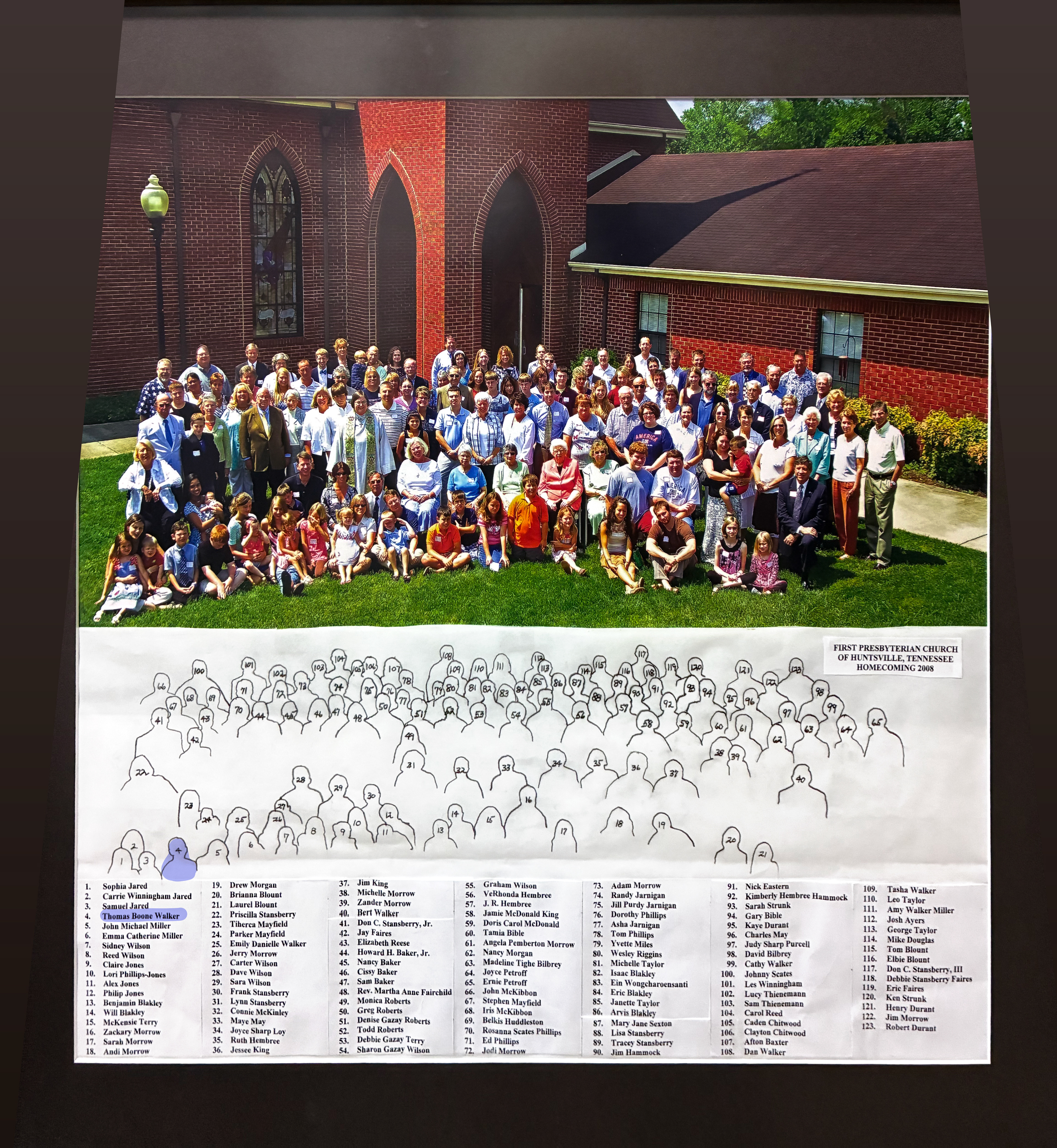 Growing up, my church took a group photograph of attending families every Easter. The walls of the church are lined with decades of these photos. Beneath each framed photo was a hand-drawn sketch my pawpaw would make. Before he passed away, he meticulously drew each person’s silhouette and numbered their head to indicate their name in a numbered legend sheet.