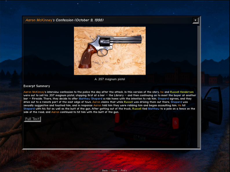 An investigative documentary game that explores the 1998 murder of Matthew Shepard through primary source documents, revealing how grief and certainty distort our understanding of ambiguous historical events.